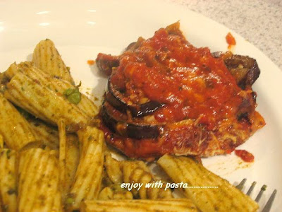 - In a baking pan first make a layer of eggplant pieces .Pour some pasta sauce on that.Sprinkle with minced garlic and basil.